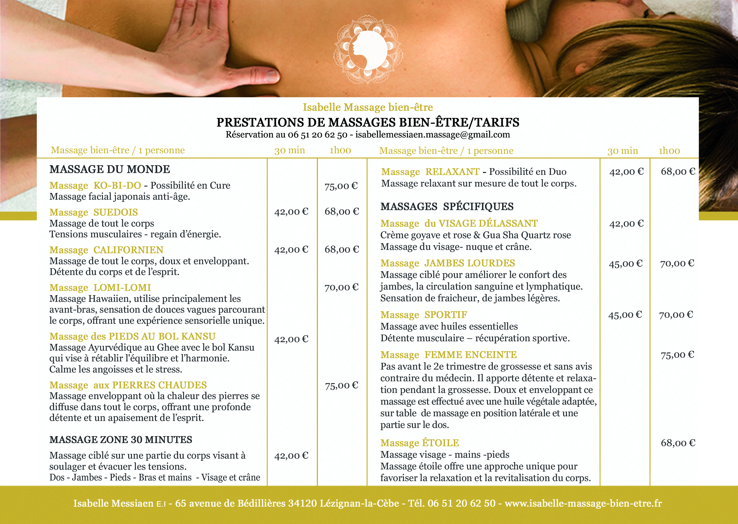 Vous cherchez à améliorer votre bien-être mental et physique, ou simplement à vous offrir une pause relaxante, vous êtes au bon endroit. Explorez mon site pour en savoir plus sur mes services de massage, mes tarifs et pour prendre rendez-vous. Je serai ravie de vous aider à vous sentir mieux dans votre corps et dans votre esprit dès aujourd’hui.